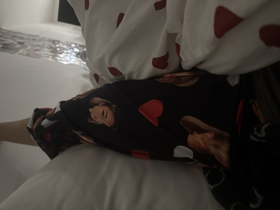A close-up shot shows a person lying in bed, mostly covered by white bedding with red heart patterns. The person is wearing dark pajamas featuring images of a woman's face, accompanied by red and white hearts. Only a small portion of the person's arm is visible. The background reveals a glimpse of a room with a blurry, light-reflecting surface. The overall perspective is slightly angled downward, focusing on the bedding and pajamas.