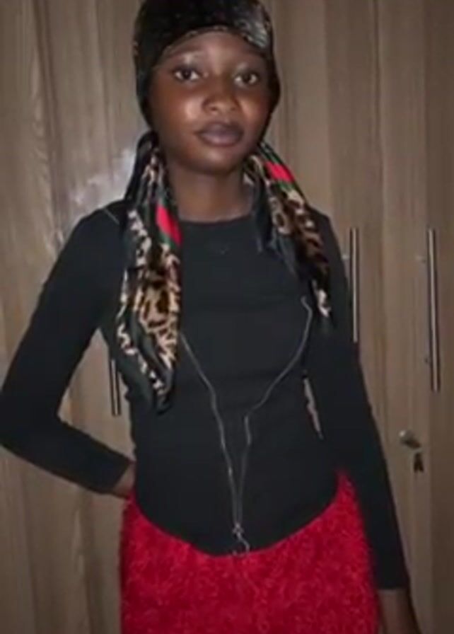 A young, dark-skinned woman is standing in front of a wooden closet. She is wearing a black long-sleeved top with a zipper, a red skirt with fringe, and a black patterned headscarf. She has her hand on her hip. The lighting changes during the video, making the scene brighter and darker.