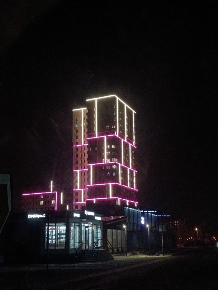 This nocturnal image depicts a modern urban scene in Krasnoyarsk, Russia, specifically at **ul. 78 Dobrovolcheskoy Brigady, 7**, showcasing a segment of the Sky Towers (Небесные Башни) residential complex. The dominant subject is a tall, multi-story building, likely residential, illuminated by prominent architectural LED lighting. White light strips define the upper perimeter and vertical segments of the building's facade, while magenta strips outline lower sections and horizontal elements, creating a distinctive geometric pattern against the dark sky. Several windows display interior illumination. In the foreground, slightly to the left of the center, stands a smaller, single-story commercial structure with a glass facade. Its interior is brightly lit, revealing merchandise or shelving. Above its entrance, the sign "Булочная" (Bakery) is visible, with "подарки" (gifts) partially visible on an adjacent section. Steps lead up to the entrance. To the right of this structure, another low-rise building features blue or white accent lighting along its roofline. The ground in the immediate foreground appears paved, possibly covered with a light layer of snow or frost, reflecting some of the ambient light. Streetlights are visible further down a street or thoroughfare on the right side of the frame. The sky is uniformly dark, indicating nighttime. No individuals, vehicles (beyond distant lights), or explicit activities are discernible within the frame.