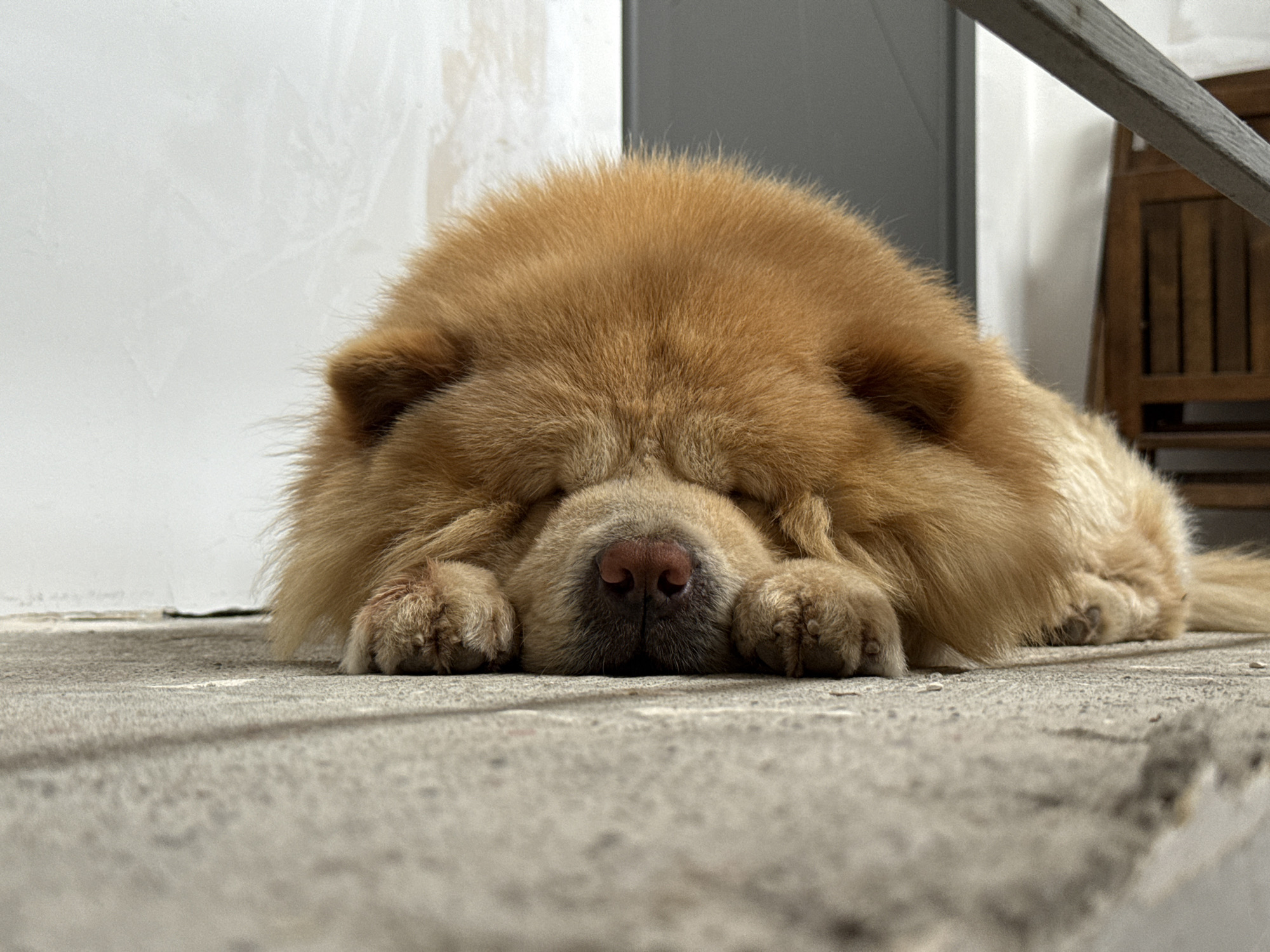 - "A close-up, low-angle shot depicts a golden-brown Chow Chow dog asleep on a gray concrete surface" by FM-SY6Xx1, licensed under CC BY 4.0