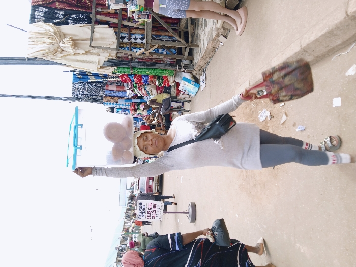 The image portrays an outdoor market scene in Masvingo, Zimbabwe, under an overcast sky. A middle-aged woman is positioned centrally in the foreground, walking forward while looking towards the viewer. She carries a transparent rectangular plastic container, featuring a light blue lid, balanced on a white fabric pad on her head; her right arm is raised to support the container, which holds several round, light-colored food items, possibly bread or pastries. She wears a light grey, long-sleeved top with sequin details, grey leggings, white ankle socks with red lettering, and grey slide sandals. A black fanny pack is worn across her chest, and she carries a multi-colored floral patterned bag in her left hand. To the woman's immediate left, another woman wearing a dark patterned dress with white trim and a pink headscarf walks away from the camera, carrying a dark bag. Further in the background on the left, additional pedestrians and a parked vehicle are visible, along with a white sign mounted on a pole displaying text such as "SALES REPS" and "SALES BUY NEEDED." The ground is a paved surface, exhibiting scattered paper and debris. On the right side of the scene, numerous market stalls are visible, constructed from wooden frames and metal poles. These stalls display a variety of fabrics and textile goods, including rolled bolts of cloth and draped garments. A person is seated on a low stool amidst the merchandise, partially obscured. A mannequin's lower legs, clad in shorts, are visible on a low platform to the far right. A dark utility pole extends vertically upwards from the right side of the frame.