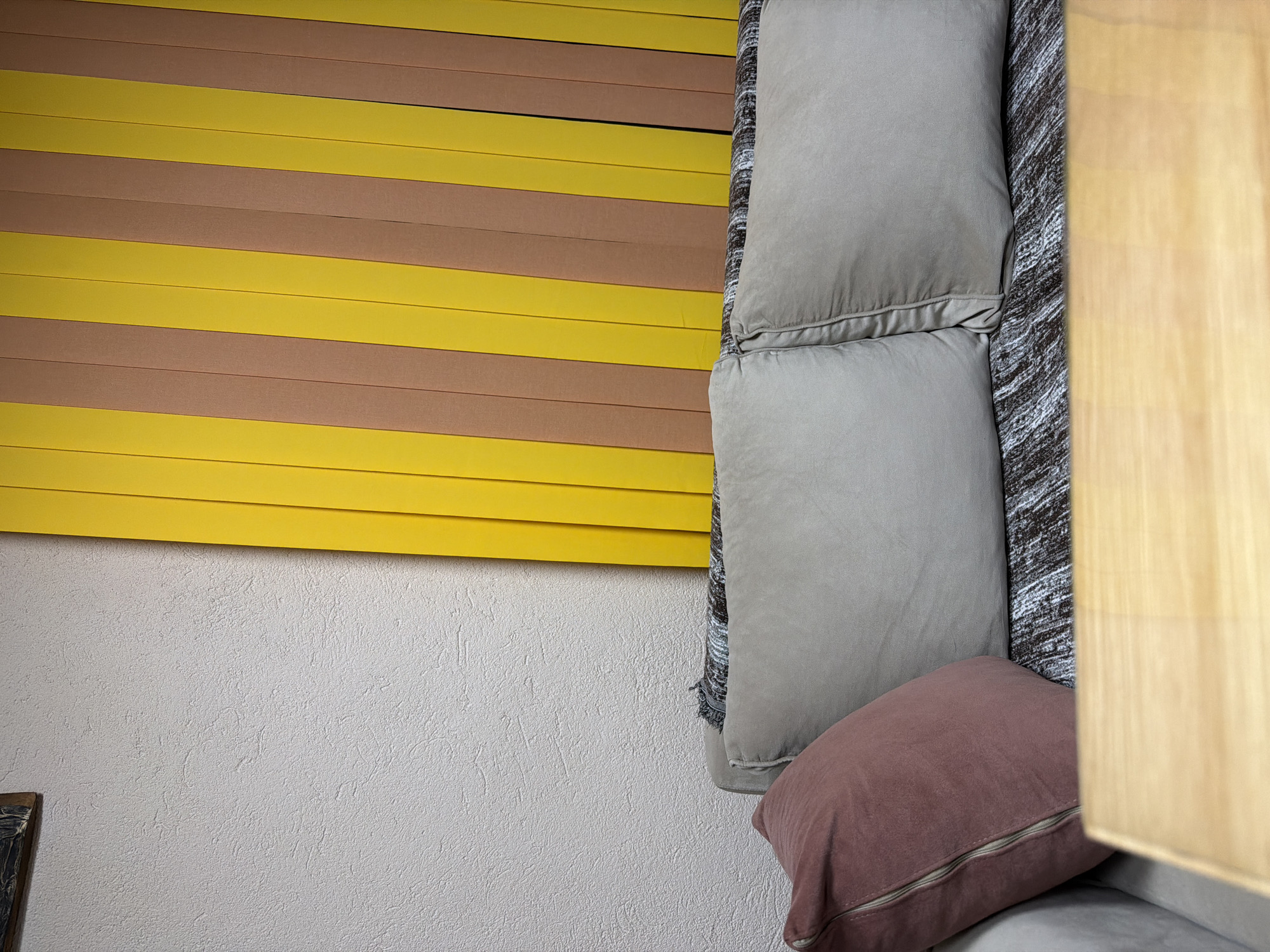 A partial view of an interior in Panagyurishte, Bulgaria is shown. A wall is painted in a light neutral color. A modern decorative panel of alternating yellow and brown horizontal planks adorns the upper part of the wall. The right side of the frame is filled with a section of a sofa or similar furniture piece, featuring stacked grey pillows and a brown decorative pillow at the bottom. A light-colored wooden or veneer panel is positioned vertically at the far right of the image, partially obscuring the view. The overall impression is a contemporary domestic setting.