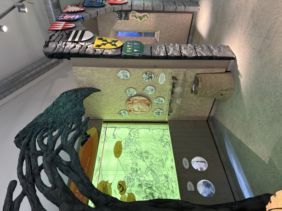 An indoor exhibition space, identified as being in Vavřinec, Czechia, is depicted. The scene features light-colored oriented strand board (OSB) wall panels, a light grey floor, and a white ceiling with exposed silver ventilation ducts and track lighting. To the left, a large, dark, gnarled sculpture, resembling tree branches and roots with a metallic teal-green sheen on some surfaces, extends upwards and partially across the ceiling, framing a significant portion of the exhibition. Below this sculpture, a large, rectangular, internally illuminated display panel with a green tint is embedded in the OSB wall. This panel exhibits a detailed, historical line-drawing map or landscape featuring figures and structures, overlaid with yellow-orange speech bubbles and bat icons containing text, and a horizontal timeline marked with "10th century" and "1000". Below this main display, two circular cutouts in the wall offer views into internal exhibits, one appearing to contain dark, granular material. Adjacent to the green display, on the same OSB wall, a cluster of nine circular and oval plaques is arranged. A central oval plaque displays a red-brown illustration of a robed figure, while the surrounding eight smaller circular plaques feature black and white illustrations of various scenes. A small white speech bubble text box is affixed below one of these plaques. Below the plaques, two clear glass shelves are visible; the upper shelf holds several rolled documents or scrolls. On the floor beneath the glass shelves, a light brown, beehive-shaped cylindrical object with a small, round opening at its base is positioned. To the right, a faux stone archway, constructed from dark grey, textured material mimicking rough-hewn blocks, serves as an entrance to an adjacent exhibition area. The archway and its immediate surrounds are adorned with multiple heraldic shields of various colors and designs, including black and white stripes, yellow with a black cross, red and white vertical stripes, and white with a red crescent. A green informational sign with smaller shield icons and text is affixed below the yellow shield on the archway's vertical support. Beyond the archway, further OSB walls are visible, along with a vertical light-blue illuminated display and a green map-like cutout on the far wall. No individuals are present in the scene.