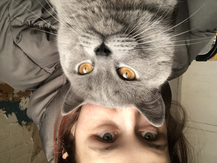 An indoor scene in Фоки, Russia, depicts a young adult individual holding a grey, short-haired cat. The human subject, with visible brown hair and green eyes, wears a grey puffer jacket. Her face is partially obscured by the cat, which is prominently featured in the foreground, looking directly at the viewer with amber-colored eyes. The cat's whiskers are visible. The background consists of a wall; the left side appears light-colored, while the right side shows peeling paint, revealing layers of light and dark blue or green beneath a lighter top coat, suggesting a state of disrepair.