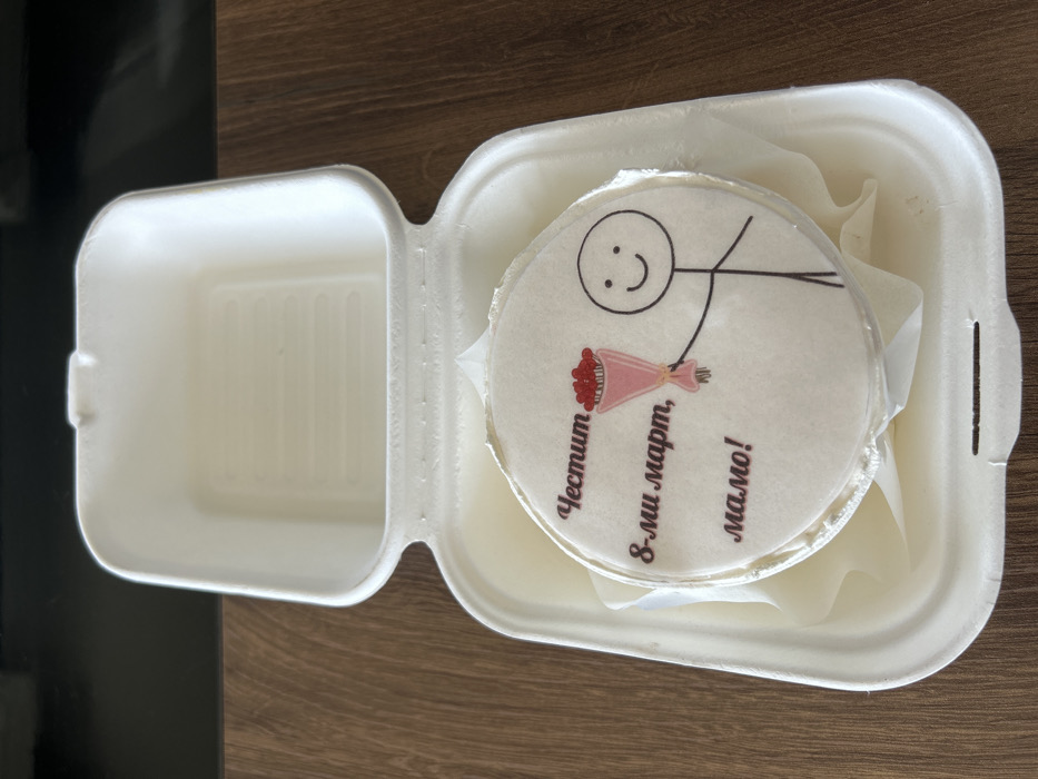 A small, round cake or dessert, topped with a white edible print, is presented in an open white molded fiber takeout container. The print features the Cyrillic text "Честит 8-ми март, мамо!" (Happy March 8th, Mom!) in red, alongside a black outline stick figure with a smiling face on the right, holding a pink-wrapped bouquet of red flowers. The dessert rests on a crumpled white paper liner within the container. The container itself is positioned on a light brown wooden surface, displaying a visible grain pattern. A dark, out-of-focus surface occupies the upper background. This scene is located in Kardzhali, Bulgaria.