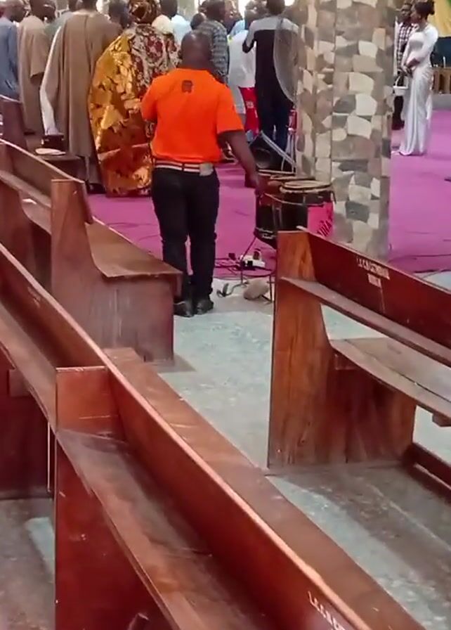 interior of a church, with wooden pews in the foreground. People are milling around on a purple carpet, mostly at the far end of the church. One man is wearing an orange shirt and black pants. There are drums and a speaker set up near the carpet. The walls of the church are stone. A red and green drape hangs in the background.