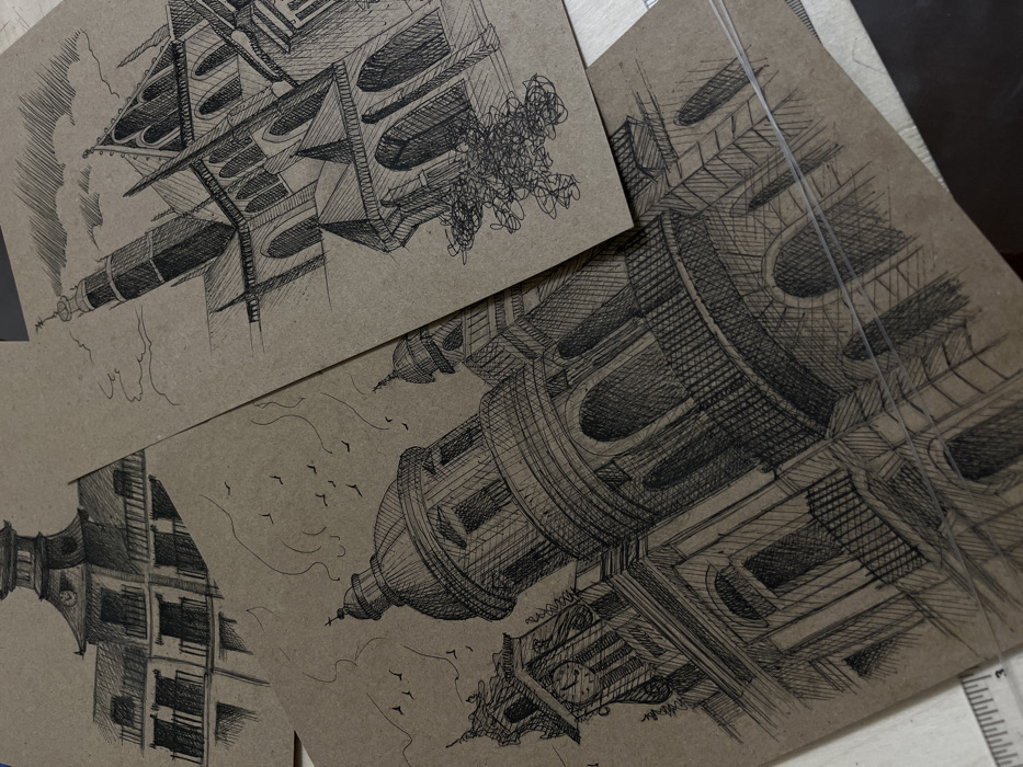 Three pen-and-ink architectural drawings on brown kraft paper are displayed, overlapping on a light-colored surface