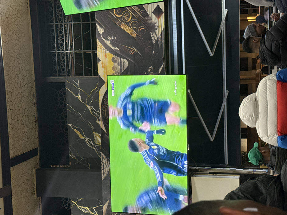 A vertically oriented shot captures a public setting with a large television screen displaying a soccer game