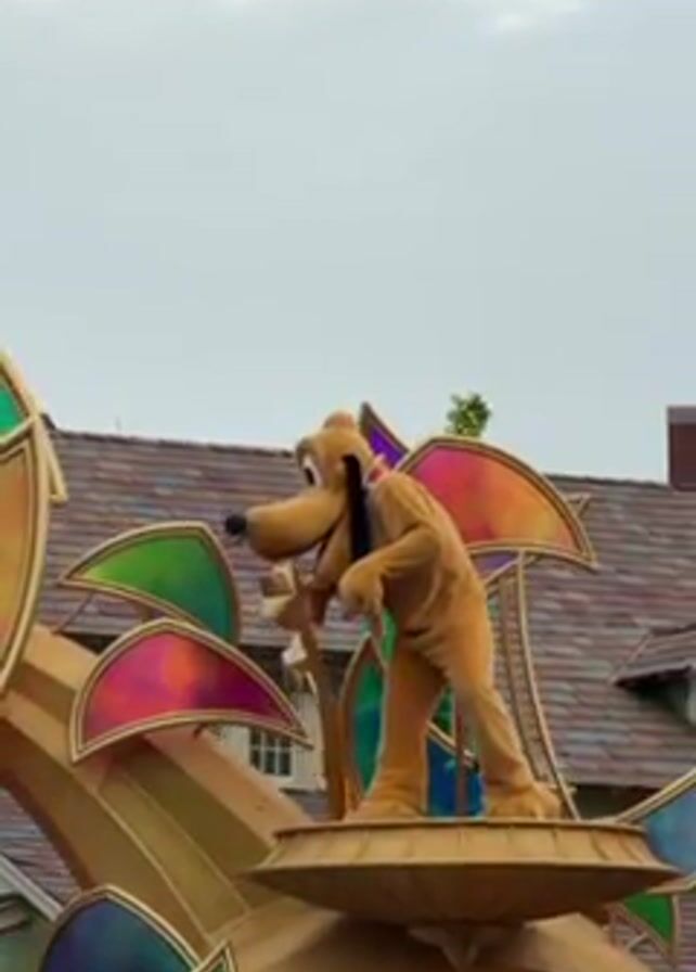 person in a Pluto costume standing on a golden structure with colorful, iridescent petal-like details. The Pluto character is initially bent over, looking down, then stands up and raises both arms in the air. A second character, wearing a green outfit, is briefly visible behind Pluto. The background shows a building with a grey shingled roof. The sky is overcast.