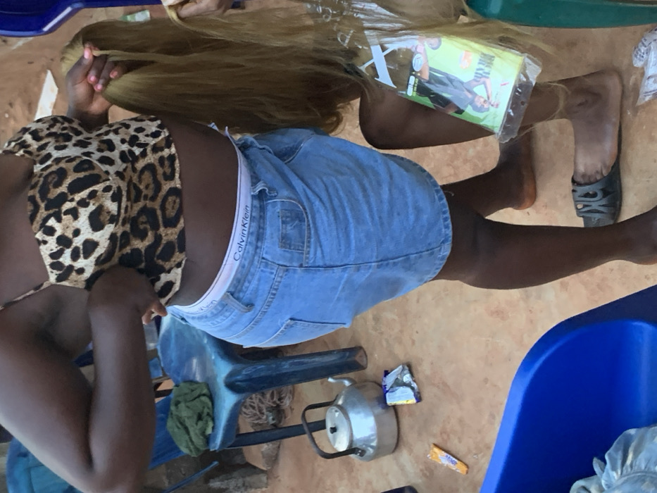 A person is seated outdoors, wearing a leopard-print top and light blue denim shorts with a visible Calvin Klein waistband. Next to them, there is a long, blonde hair extension. A clear plastic package is next to their legs, and a gray sandal is visible near their bare feet. An aluminum kettle, a blue plastic chair, and other discarded items, including food wrappers, are scattered around the ground.