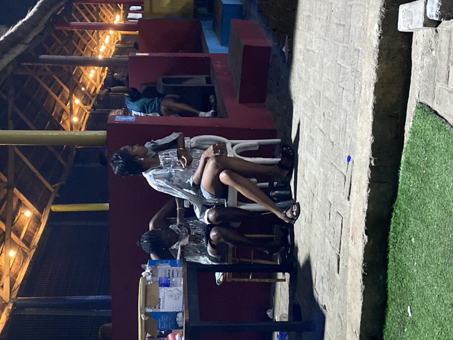Two seated individuals are positioned outside on a stone patio adjacent to a patch of artificial turf. The first person sits in a white plastic chair wearing a white patterned shirt and blue shorts. The second person sits in a metal chair wearing a dark patterned top. The surroundings include a dark brick or concrete wall, a small table holding packaged goods, and a background featuring a building with exposed wooden beams and hanging lights. Another person is observed lying down in the background.