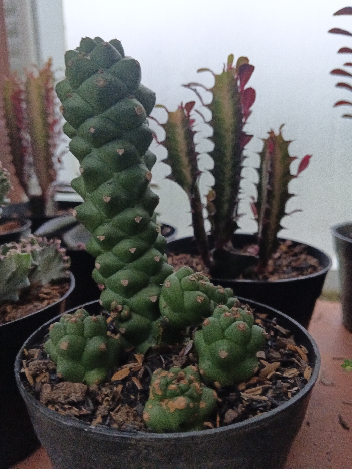 The image showcases several potted succulent plants. A prominent green succulent with a segmented, cone-like structure stands tall in the foreground. Smaller, clustered succulents surround its base in the same pot. Other potted succulents, some with reddish hues and jagged edges, are visible in the background. The succulents sit in dark-colored pots filled with dark soil. The background is softly blurred, likely due to natural light filtering through a window.
