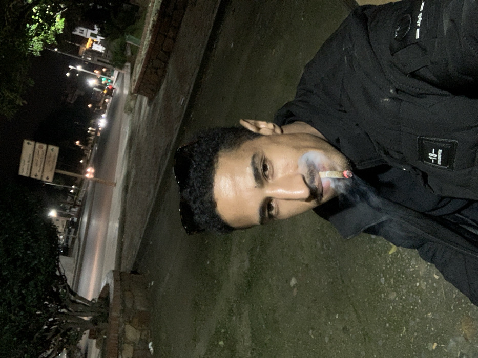 A man is seen smoking a cigarette, with smoke trailing from his mouth. He's wearing a black jacket with labels. The setting appears to be outdoors at night, indicated by streetlights, a road, and a building in the background. The photo seems to be taken at an unusual angle, as the man is turned to the side, and the scenery is tilted. The ground next to the man is grassy and appears slightly wet.
