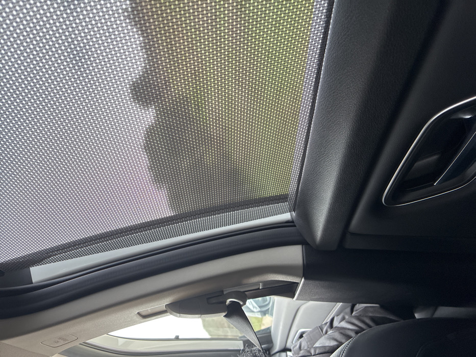 The scene is located inside a vehicle in Krustina, Bulgaria. The primary view is directed toward the passenger-side window, which is covered by a fully extended black mesh sunshade, creating a pixelated effect on the outdoor environment. Through the sunshade, the exterior reveals a green, open field in the midground, with a darker, irregular silhouette, consistent with distant trees or hills, against a light, slightly pink-tinged sky. The vehicle's interior occupies the foreground, featuring a black textured plastic door panel on the right with a partially visible silver-accented door handle. To the left, a light gray B-pillar is visible, equipped with a retracted black seatbelt and buckle. A dark, indeterminate fabric object rests on a seat in the lower-left portion of the frame. No individuals are clearly visible within the image.