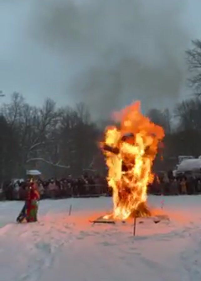 In a snowy, outdoor setting, a large straw effigy stands engulfed in flames