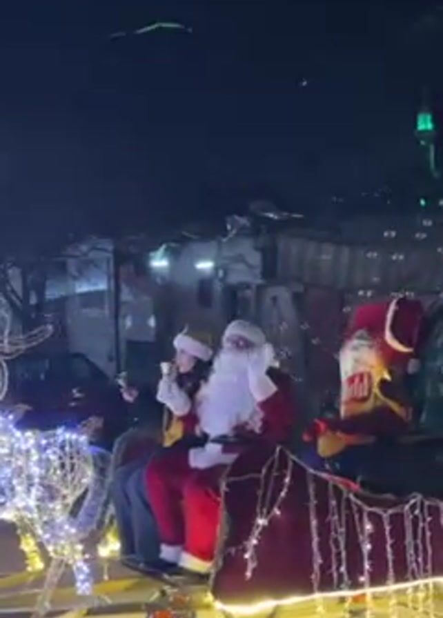 At night, in a residential area, a Christmas parade featuring Santa Claus is moving along a street filled with cars. Santa, in a red suit, is seated in a sleigh decorated with red fabric and lights, waving to the crowd. A young woman in a white hat and jacket sits beside him, also waving. The sleigh is pulled by light-up reindeer figures. Buildings and trees line the street, some decorated with lights. The overall atmosphere is festive, and the parade is moving at a slow pace.