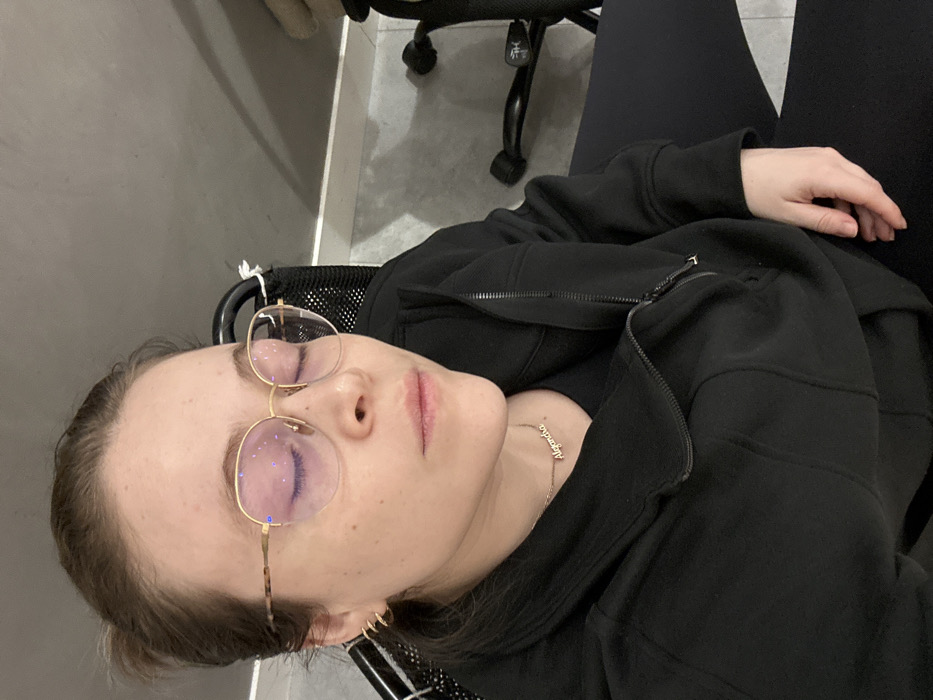 A woman with fair skin, closed eyes, and gold-rimmed glasses reclines in a chair