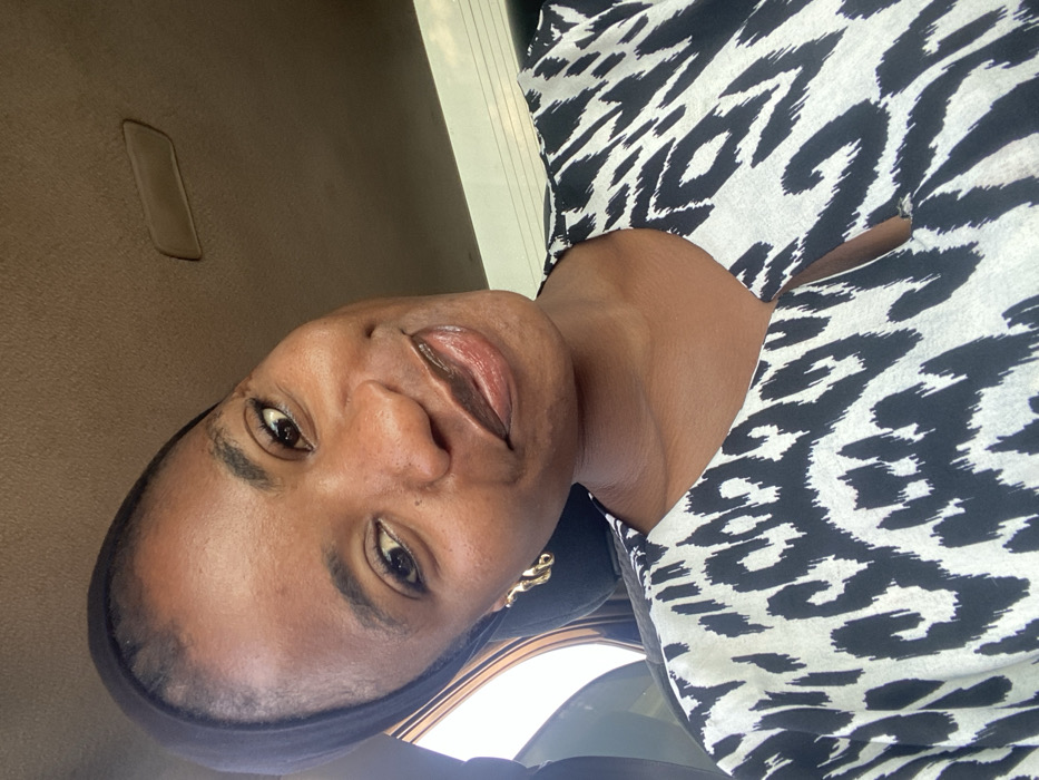 A close-up image depicts an adult female positioned inside a vehicle in Abobo, Nigeria. The subject, with dark complexion, is looking directly at the camera with a slight smile, her lips featuring a glossy appearance. Her dark hair is pulled back, secured by a black headband. She wears a black and white patterned top with a notched V-neckline. A gold-colored hoop earring is visible on her left ear. The vehicle's interior headliner is beige, and a blurred window showing an outdoor sky and faint lines is visible to the left.