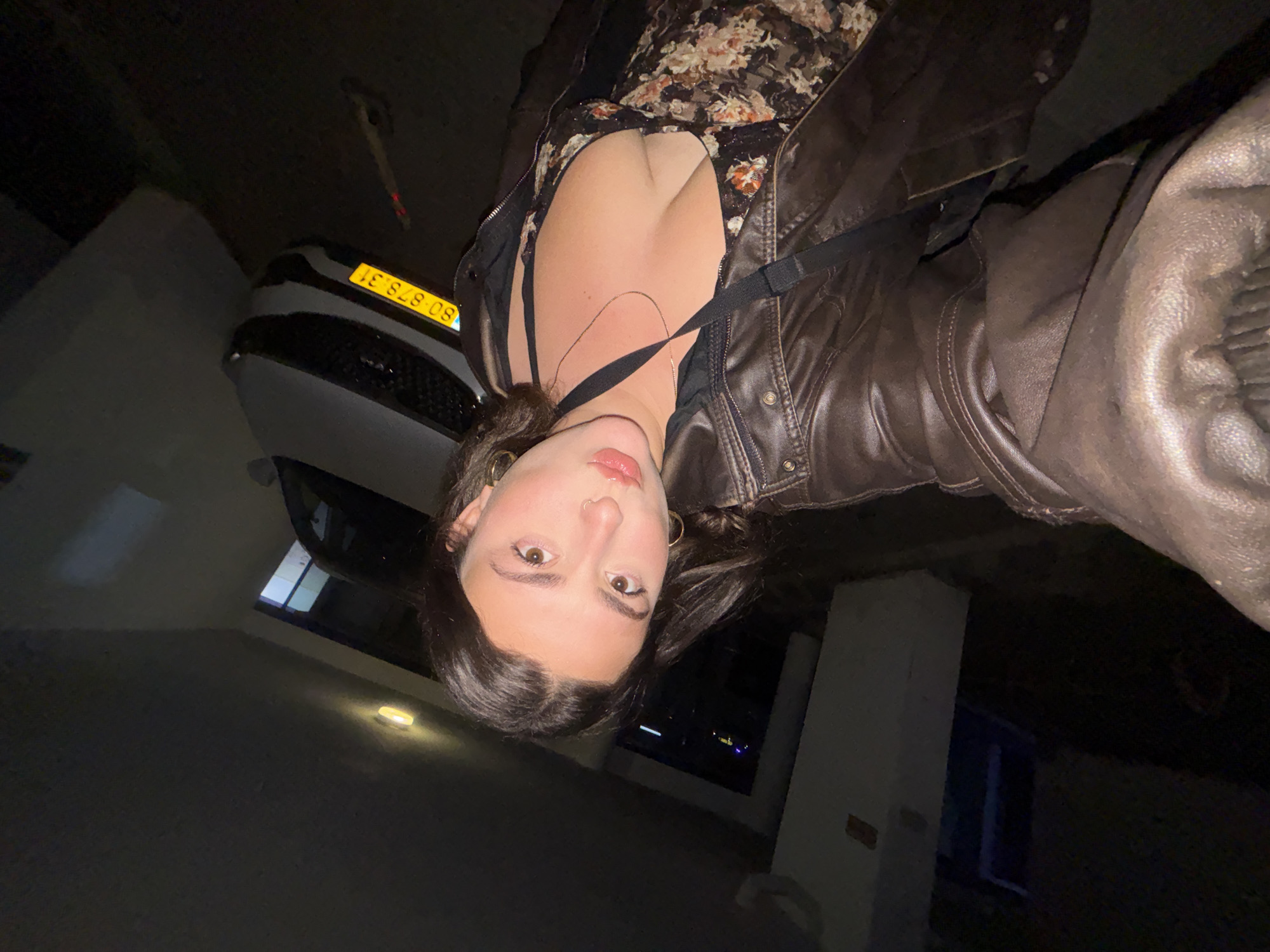 The image depicts a young female taking a selfie at night in a residential or urban outdoor setting in Eilat, Israel. She is positioned off-center, leaning slightly to her left, with her head tilted, looking directly at the camera. The female subject has dark hair, brown eyes, a nose ring in her left nostril, and gold hoop earrings. She is wearing a black bra under a dark floral-patterned dress and a brown leather jacket. Her lips are slightly parted, and her complexion appears fair. Behind the subject, a white car is parked, its rear visible. The vehicle displays an Israeli license plate, "80 878 31," confirming the location in Israel, specifically Eilat as per the prompt. To the right of the car, a long object, possibly an electric scooter with a red glowing tip, lies on the ground. The background is dimly lit, revealing a dark wall with a single wall-mounted light fixture casting an orange glow. Distant city lights are faintly visible through an opening or window in the upper left background. The overall scene suggests a nighttime environment.