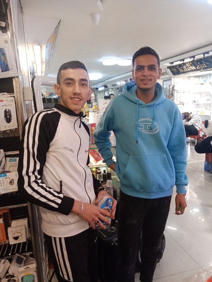 The image displays two young adult males standing in an indoor retail store in the city of Unknown, Unknown. The male on the left, with short dark hair and a light mustache, wears a white and black track jacket with an "AIR NIKE" logo and matching track pants. He holds a transparent plastic bottle, containing a white opaque substance and bearing a blue and white label with Arabic text, in both hands at waist level. He wears a silver bracelet on his left wrist and a dark ring on his right ring finger. The male on the right, also with short dark hair and a light mustache, wears a light blue hooded sweatshirt featuring a white "D" logo (Diesel) and dark pants. He has his right hand in his pocket and holds a small green object in his left hand. He wears a silver bracelet on his left wrist. Both individuals are smiling and looking towards the camera. The background shows various retail display shelves and cases filled with electronics and other merchandise, including a prominent sign with Arabic script reading "Khawaja." A seated person and a black and white panda plush toy are partially visible in the far background. The store features white walls, reflective tiled flooring, and overhead lighting.