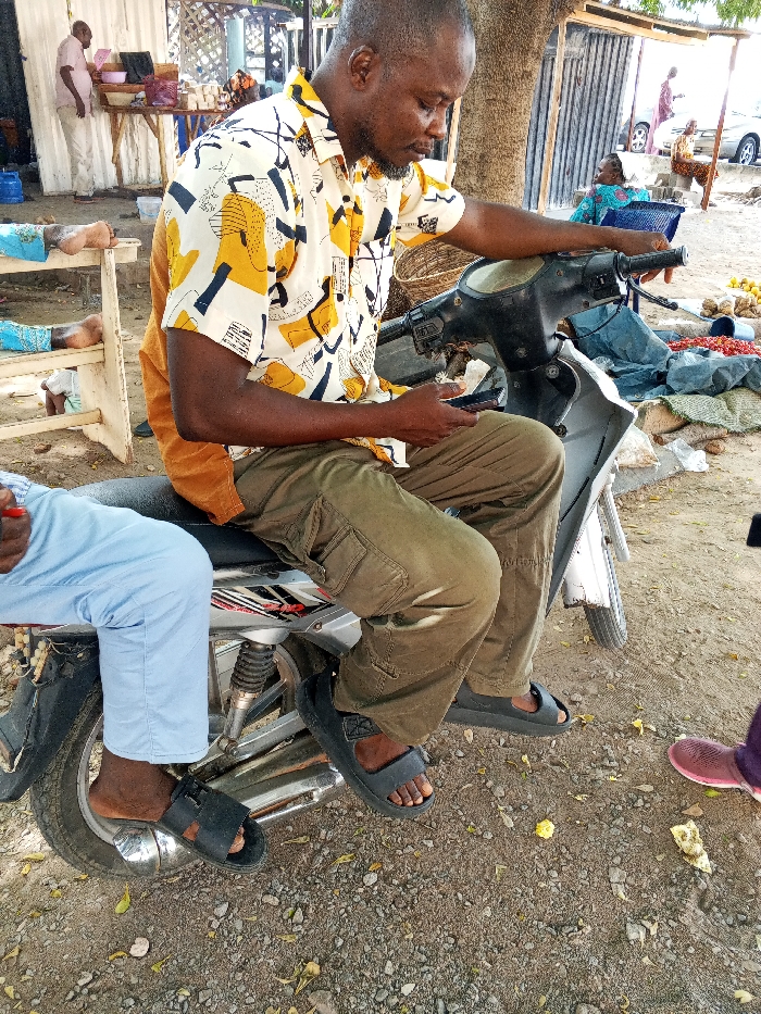 An outdoor market scene in Lokoja, Nigeria, is depicted under daylight conditions. In the immediate foreground, an adult male with short dark hair and a beard sits astride a black and silver scooter. He wears a yellow, black, white, and orange patterned short-sleeved shirt, olive green cargo pants with pockets, and black slides. Both hands hold a dark-colored smartphone, at which he is looking down. Behind him on the scooter, the lower legs of a second individual are visible, clad in light blue pants and black slides. The ground surface is unpaved, consisting of dirt and gravel with scattered dry leaves and refuse. To the right of the scooter, various produce items, including red tomatoes and yellowish fruits, are laid out on the ground, possibly on tarps, with a woven basket nearby. A large tree trunk is situated behind the primary subject. In the mid-ground, a woman in a blue patterned garment is seated near additional market goods. Further left, a man in light-colored clothing stands near a wooden market stall displaying various items. The background includes structures made of corrugated metal sheeting and a light-colored vehicle. A partially visible foot in a pink shoe is present in the lower right foreground.