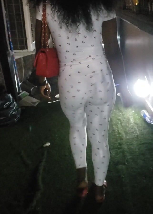 A person with dark, curly hair is wearing a white patterned jumpsuit and red shoes, and is carrying a red purse. They are standing outside in what appears to be a dark urban environment. The scene is illuminated by overhead lighting. There are garbage bags and debris nearby. The person is holding a phone.