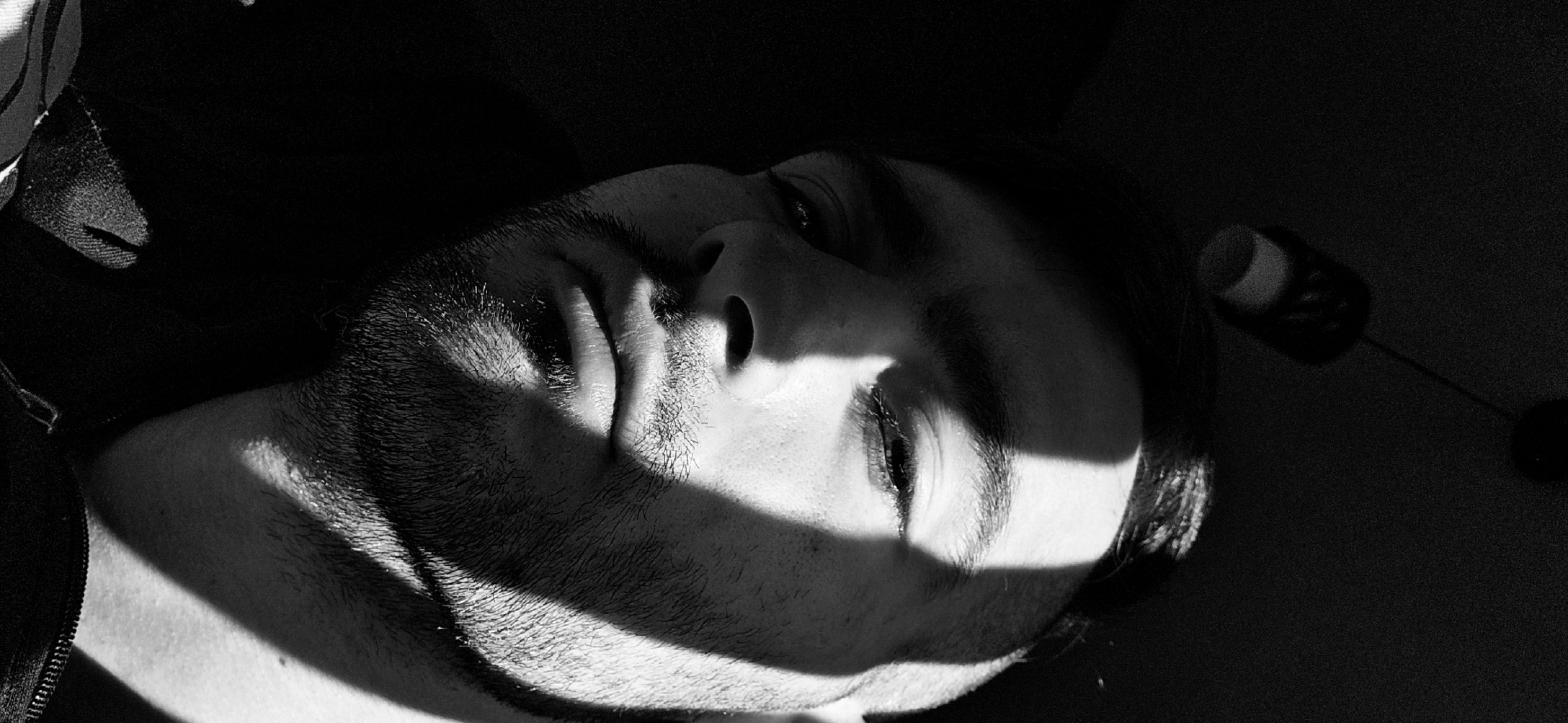 A close-up, black-and-white photograph depicts a person's face in stark light and shadow
