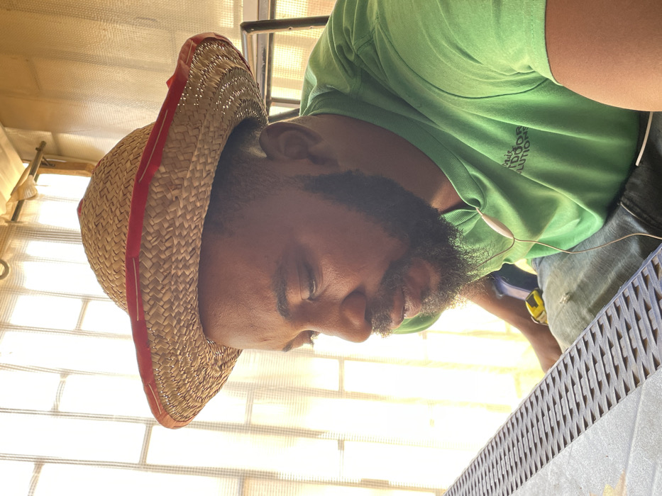 The scene depicts an adult male in Barakin Akawo, Nigeria, observed from the chest up in profile, looking downwards towards the left. He is an individual with dark skin, a close-cropped dark haircut, and a neatly trimmed dark beard and mustache. He wears a light-colored straw hat with a red fabric band, a light green short-sleeved polo shirt featuring a partially visible white logo that reads "Doris Outdoor Solutions," and blue denim trousers, one of which displays a distressed patch on the right thigh. A white wired earphone with a cylindrical inline control unit hangs from his right ear. A yellow and blue object, possibly a measuring tape or tool, is partially visible near his right hip. In the immediate foreground, a dark grey, textured surface with a grid pattern is present, extending from the lower left corner. The background consists of a bright, diffused light source behind translucent, grid-patterned material, possibly a window covering or screen, suggesting an indoor or sheltered outdoor setting. A dark metal frame structure is indistinctly visible behind the subject's right shoulder. The light source appears to be from direct sunlight, backlighting the subject and causing the background to be somewhat overexposed.