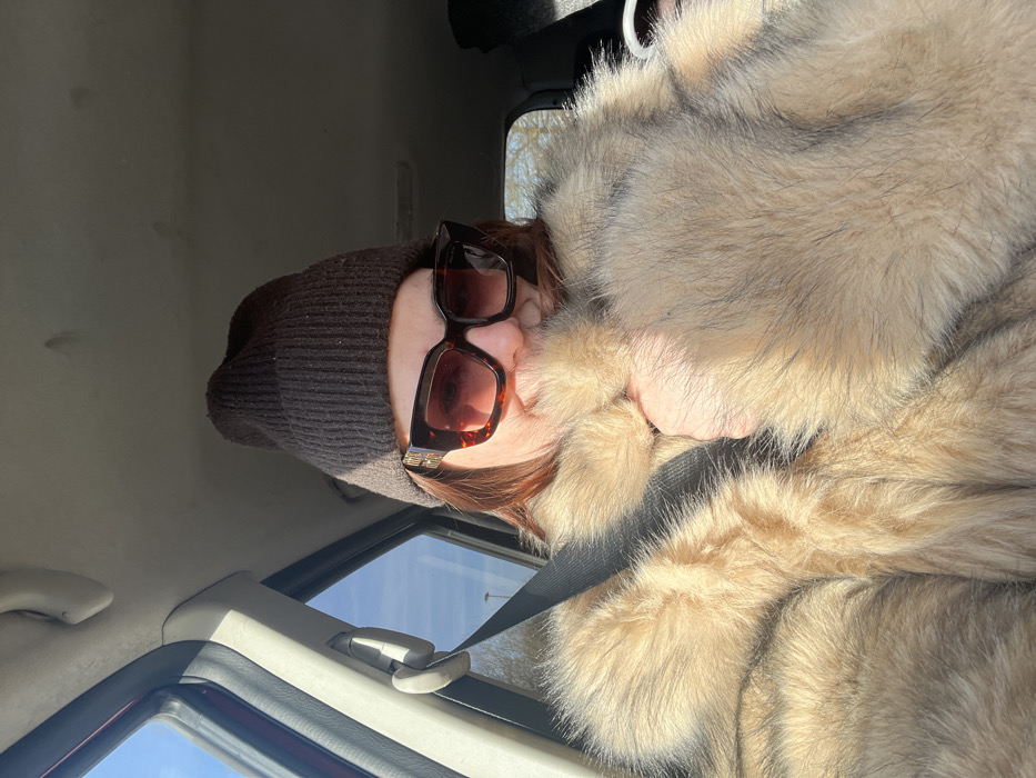 The image displays an individual, appearing to be an adult female, seated within the front passenger compartment of a vehicle during daylight hours. The specific location within Marcq-en-Barœul, France, is not identifiable from the visual content. The individual wears a dark brown knitted beanie and large, square-framed tortoiseshell-patterned sunglasses, featuring prominent gold-colored "Miu Miu" logos on the temples. Reddish-brown hair is visible beneath the beanie and around the sunglasses. She is dressed in a voluminous, light brown or beige fur coat, possibly fox fur, characterized by varying fur lengths and dark tips on some hairs. A black seatbelt is correctly positioned diagonally across her chest, over the fur coat. Her left hand is partially tucked into the fur, obscuring the lower portion of her face from the mouth down. A subtle upward curve is discernible beneath the sunglasses, consistent with a slight smile. The vehicle's interior shows a light-colored (off-white or light grey) headliner with visible minor discolorations or marks. A dark red or maroon A-pillar and door frame are visible on the left side, featuring a grey plastic seatbelt guide. Through the car windows, a clear blue sky and bright sunlight are evident. Blurred green foliage and a faint dark vertical pole or structure are visible in the distant background, suggesting an outdoor environment. Strong natural light illuminates the scene, creating distinct highlights and shadows.