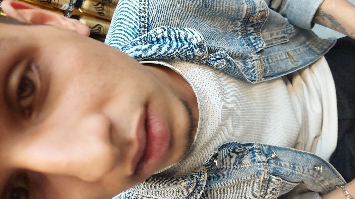 A close-up, head-and-upper-torso portrait depicts a male individual within an indoor commercial establishment located in Barza Municipality, Syria. The subject has brown eyes, a prominent nose, full lips, and light stubble on the chin. He is dressed in a faded light blue denim jacket with metallic snap buttons, worn over a white, textured crew-neck long-sleeve shirt. A silver-colored chain bracelet adorns his left wrist, and a tattoo is visible on his lower right forearm. The background, largely out of focus, displays a shelf or rack stocked with numerous golden-colored bottles featuring Arabic script, specifically 'أس' (AS), indicative of a retail or service environment.