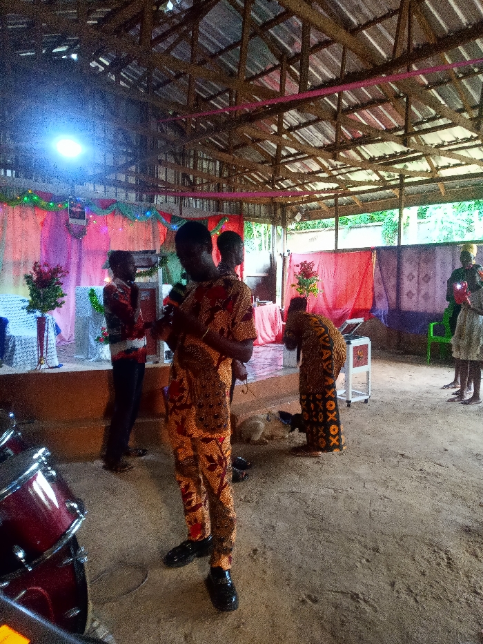 An indoor scene within a large, open-sided structure in the city of Unknown, Unknown, features a corrugated metal roof supported by exposed wooden beams. The floor is composed of packed earth. The background exhibits a makeshift stage area adorned with draped fabrics in pink, red, green, and blue, illuminated by string lights. Two artificial red floral arrangements are positioned on the stage, which also displays a white plastic chair. Five dark-skinned individuals are present. In the mid-ground, a male wearing a patterned orange, brown, and red full-body outfit and shiny black shoes stands holding a microphone. Partially obscured behind him is another individual. To the left, on the raised stage, a male in a patterned red, white, and black shirt and dark trousers stands facing the center. To the right, another individual in a long, patterned dress is bent forward, facing away from the camera, attending to something on the ground next to a small, white and red wheeled cart. A small, light-colored animal, possibly a cat or small dog, rests on the ground near this individual. Further to the right, two additional individuals stand; one is holding a red electronic device, possibly a smartphone or tablet. In the left foreground, part of a red drum kit is visible. Green foliage is discernible through the open sides of the structure.