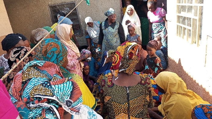 The image displays a dense gathering of approximately 20-30 individuals, predominantly women and girls, situated in an outdoor or semi-enclosed space within the city of Afaka, Nigeria