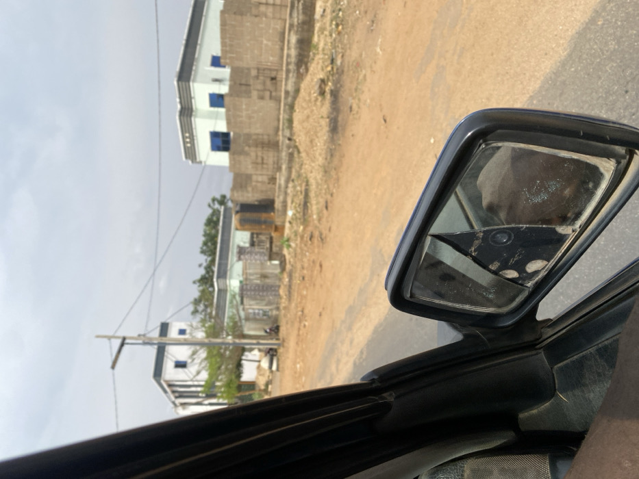 The image depicts a roadside scene in Okene, Nigeria, viewed from the interior of a vehicle. In the foreground, a dark-colored vehicle door frame and a portion of a human arm are visible on the left. A black plastic side-view mirror, displaying a significantly fractured and dirty glass surface, occupies the lower right, reflecting an indistinct light-colored area. The midground features a reddish-brown dirt road, with a narrow strip of paved asphalt visible on the far left. Sparse, dry vegetation and light-colored debris are scattered on the unpaved ground. In the background, multiple structures are present under an overcast or hazy sky. To the left, a multi-story white building with dark vertical accents and blue-tinted windows stands, with a utility pole and overhead power lines positioned in front. A small white vehicle and a motorcycle are discernible near this building. To the right, two single-story buildings with light green or pale yellow facades and blue-tinted windows are visible. Large, organized stacks of grey concrete blocks are arrayed in front of these structures, indicating material storage or ongoing construction. The overall scene suggests a semi-developed urban or suburban environment with unpaved thoroughfares and active building projects.
