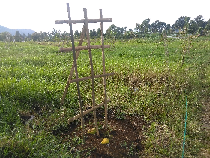 This image depicts an open agricultural field, purportedly in Røros, Norway. In the foreground and slightly off-center, a rustic, A-frame-style wooden trellis stands approximately 1.5 to 2 meters tall. It is constructed from rough poles, likely bamboo or light wood, lashed together with rope or twine, forming three horizontal crossbeams. At the base of the trellis, a circular patch of dark, disturbed earth, roughly 0.5 meters in diameter, indicates a planting site. Within this area, a small green plant seedling is visible. Two distinctly yellow, smooth-skinned, bulbous objects, resembling gourds or specific fruits, rest on the soil near the seedling, one appearing slightly larger than the other. The immediate foreground around the planting site is covered in a mixture of vibrant green and drier, brownish grasses and weeds. To the left of the trellis's base, a small patch of wet or muddy soil is discernible. A slender, vertical green stake or pipe is partially visible on the far right edge of the frame, emerging from the taller grass. The midground consists of an expansive, undulating field of green grass and scattered taller weeds. Several other similar, less defined wooden trellis structures are visible further back in the field, suggesting a larger agricultural or horticultural plot. The background features a dense line of dark green trees forming a distant horizon. Beyond the trees on the left, faint silhouettes of hills or mountains are discernible against a bright, hazy sky. The sky is clear, occupying the top quarter of the frame, indicating daylight conditions. No human figures or discernible animal life are present in the scene. The overall arrangement suggests ongoing cultivation of climbing plants or crops.