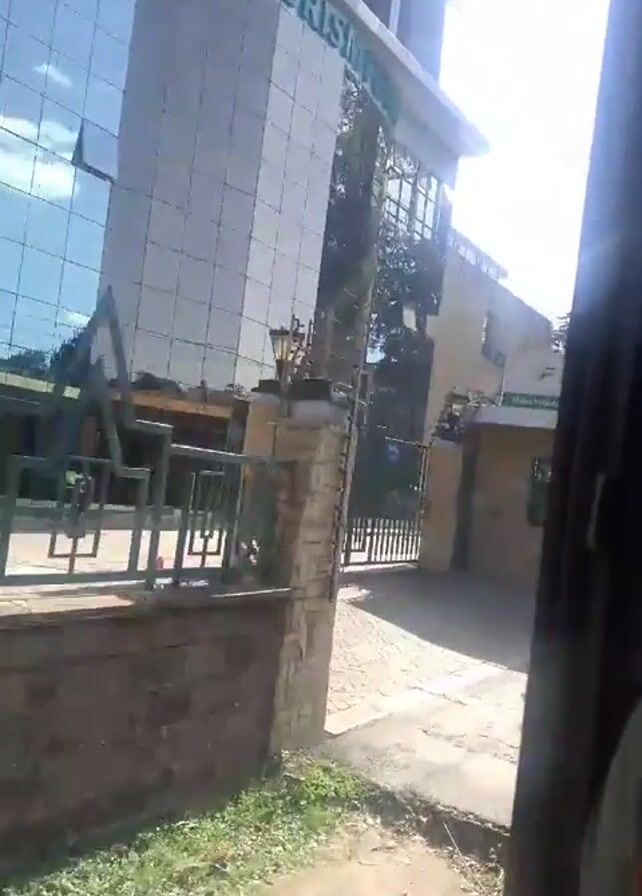 view from inside a moving vehicle, likely a bus or car, passing by a building