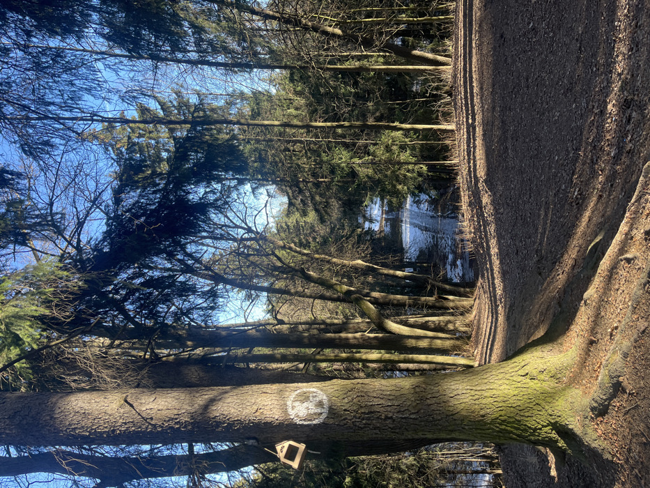 The image depicts a wooded landscape in Pargolovo, Russia. In the left foreground, a large tree trunk with textured bark is visible, featuring a small, light-colored, house-shaped bird feeder attached to its side. Below the feeder, a white circular marking containing an abstract internal design is painted on the trunk. The ground in the immediate foreground consists of exposed soil and scattered leaf litter, with prominent shadows cast by direct sunlight. The scene slopes downward towards the middle ground, where a path or road, partially covered with patches of snow and ice, recedes into the distance. This path is bordered by numerous trees, including dense evergreen conifers and deciduous trees with bare branches. The background reveals additional forestation under a clear, blue sky. No individuals or specific activities are observable within the frame.