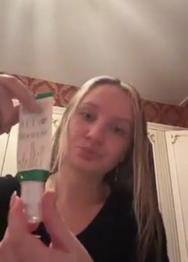 young woman indoors in what appears to be a bathroom or bedroom, given the wallpaper and cabinets visible in the background. She has wet, shoulder-length hair with blonde highlights near her face. She wears a black V-neck shirt. She is holding a small tube of cream or lotion in her hands. She squeezes some of the product onto her hand and then rubs it onto her neck. The lighting is bright, with a ceiling light fixture visible above.