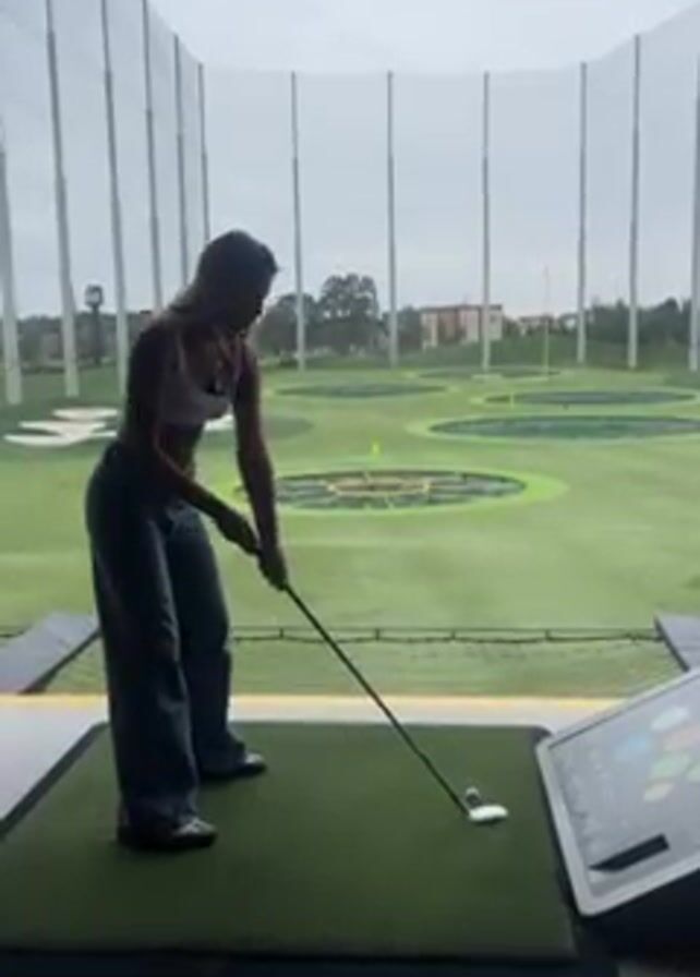 A young woman is seen in a side profile at a Topgolf facility. She is wearing a white tank top and dark-wash, wide-legged jeans. She is gripping a golf club, poised to strike a ball placed on a tee on the synthetic turf in front of her. Beyond her and the netting of the enclosure, there is an open green space with various targets set up for players to aim at. A digital touchscreen is visible on the right side of the frame. The sky is overcast.