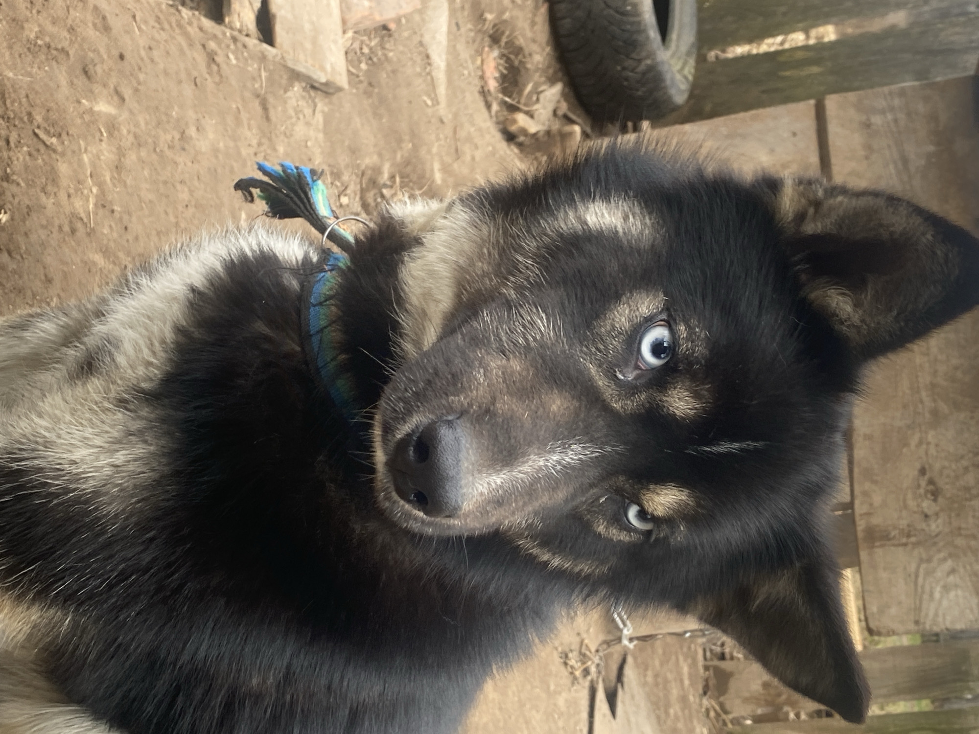 A close-up, angled shot reveals a dog with striking blue eyes and predominantly black and grey fur. The dog is wearing a blue and turquoise collar with a frayed decorative attachment. The setting appears to be an outdoor area in Zhigalki, Russia with dirt and wood planking visible in the background. A tire leans against a wooden structure in the background.