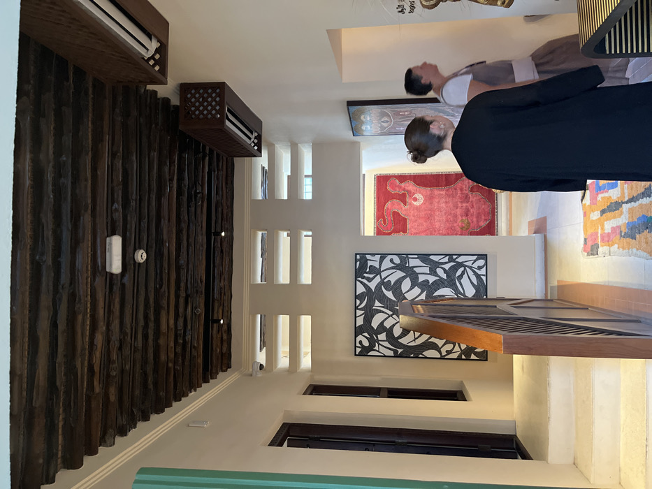 The image displays an interior view of an art gallery or cultural space located within the Heart of Sharjah district, United Arab Emirates. The prominent ceiling features numerous dark, rough-hewn wooden beams running horizontally, housing a white smoke detector, a rectangular white air vent, and two black track lights. Two dark brown wooden ventilation units with slatted fronts are mounted on the upper right wall. The walls are painted a uniform cream color. On the left side, a dark wooden door and a smaller dark wooden window are set into the wall, with a partial vertical green stripe visible at the far left edge. A dark wooden railing for a staircase ascends on the left, leading to light-colored steps. The far wall incorporates a pattern of six rectangular, horizontal openings arranged in two rows of three. Below these openings, two large framed artworks are displayed. The left artwork is a vertical piece featuring a black background with intricate white, abstract, calligraphic-like patterns. The right artwork, partially visible through a doorway, is a large, vibrant red textile piece with an organic, embellished shape. The floor is tiled with light-colored material. A multi-colored geometric rug, primarily featuring orange, blue, white, and black hues, is positioned on the floor in the foreground. A dark, horizontally slatted bench or console table is partially visible on the far right. Two individuals, identified as adult females, are captured from behind, walking from right to left across the middle ground. The person in the foreground wears a long-sleeved black garment and has her hair styled in a bun. The second person, positioned slightly behind and to her left, wears a light-colored top and a tan dress or apron-style garment.