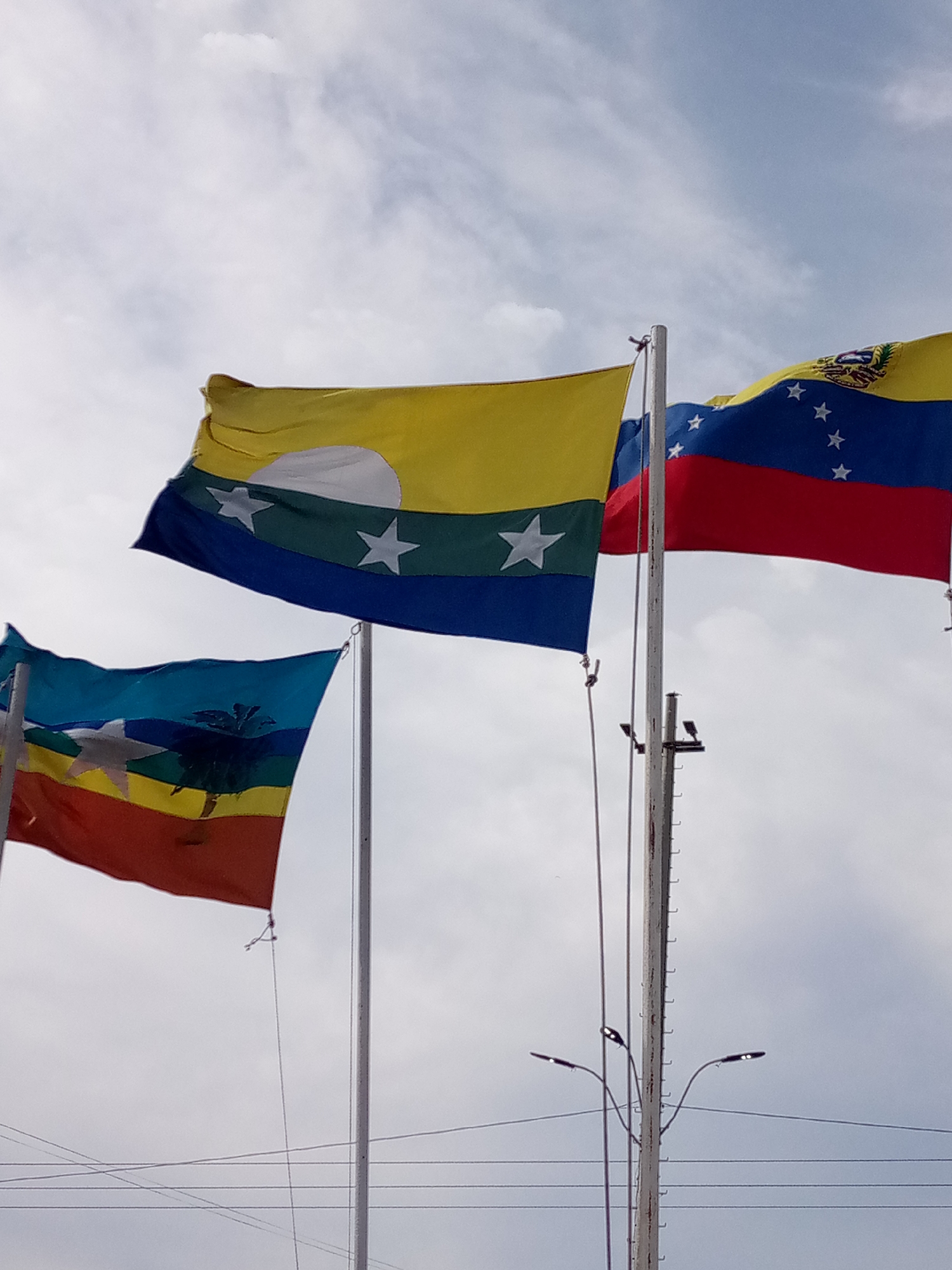 three flags flying in front of a cloudy sky. The flags are likely located in Las Guevaras, Venezuela. The flag on the right is the flag of Venezuela, with yellow, blue, and red stripes and white stars. The middle flag has a yellow top stripe, a green middle stripe with three white stars, and a blue bottom stripe. The flag on the left has a blue top stripe, a green middle stripe, and a red bottom stripe, along with white stars and a dark figure that may be a palm tree. Flagpoles and streetlights are also visible in the image.