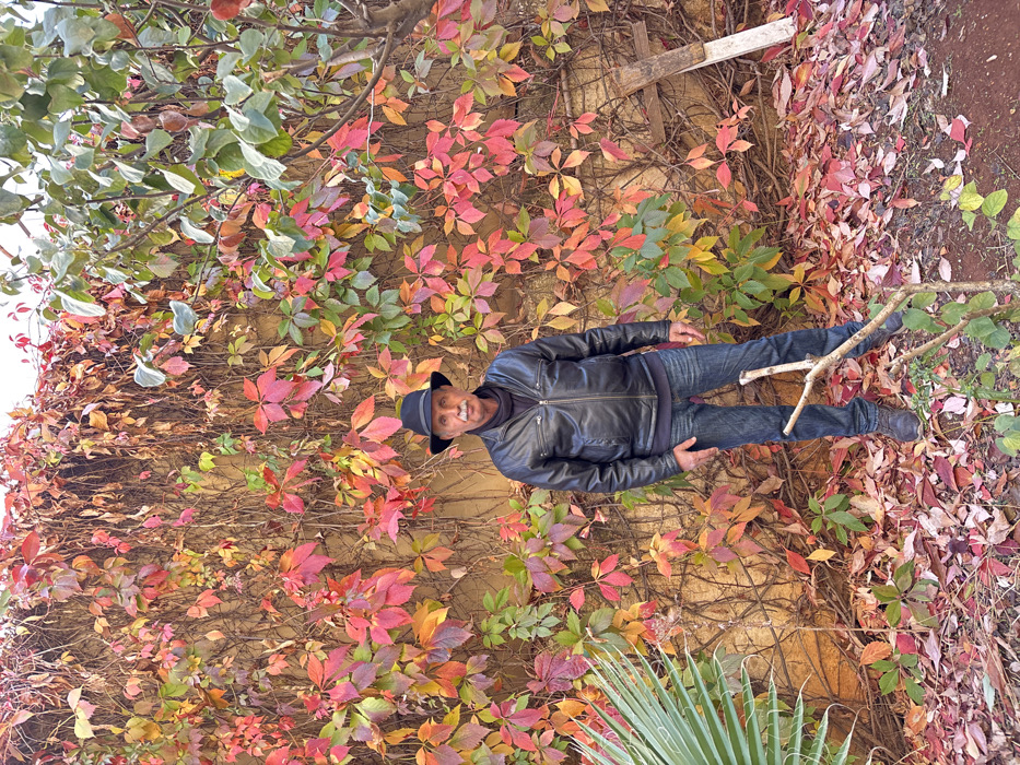 The image portrays an adult male standing in an outdoor setting in Meknes, Morocco. The man, appearing to be middle-aged or elderly with a white mustache and dark hair, is positioned centrally against a vibrant backdrop. He is wearing a black fedora-style hat, a black zippered leather bomber jacket over a dark high-collared garment, blue jeans, and dark lace-up shoes. His hands are at his sides, and he faces the camera directly with a neutral expression. Behind the man, a light-colored wall is almost entirely covered by dense climbing vines displaying autumn foliage in vivid shades of red, orange, yellow, and green. Bare woody stems of the vines are visible interlaced across the wall. The ground in the foreground and around the man's feet is heavily blanketed with fallen leaves, mirroring the colorful array on the wall, with sections of dark soil exposed. To the far left, a large, light green palm frond is partially visible. Directly in front of the man, a small, multi-stemmed plant with green leaves emerges from the ground. On the right, a wooden stick or branch leans diagonally against the wall, next to a vertical piece of white material. A tree with green and reddish leaves and visible branches occupies the upper right portion of the background. The scene is illuminated by natural, diffused light under an overcast sky.