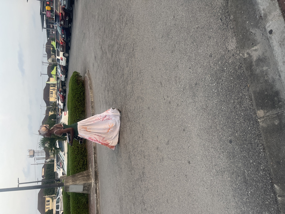 A woman stands near a trimmed hedge, wearing a dark top and long, light-colored skirt with floral patterns. Cars are parked along the other side of the hedge. A gray paved area fills the majority of the frame. Buildings and utility poles are visible in the background under a cloudy sky. The photo is taken at a slightly angled, tilted perspective.