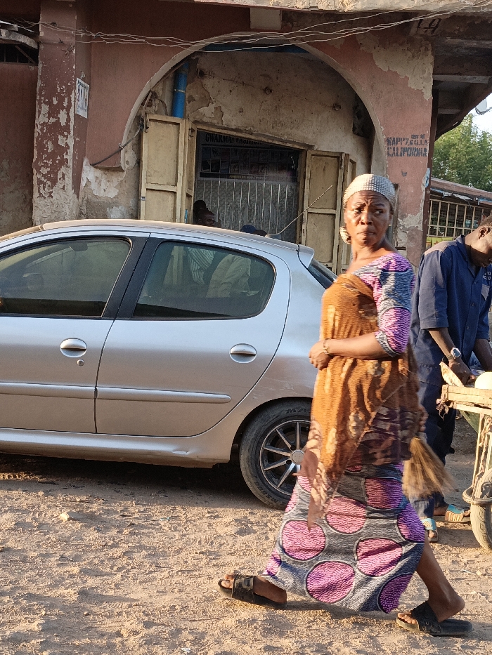 An outdoor scene in Gwagwarwa, Nigeria, depicts a woman walking past a parked silver hatchback car and a weathered building