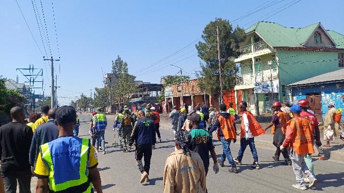 The image depicts a daytime street scene in Gisenyi, Rwanda, characterized by clear weather and bright sunlight. A large group of approximately 20-30 individuals, primarily men, occupies the asphalt road, moving generally away from the camera. Many are engaged in what appears to be a community clean-up or public works activity. **People and Actions:** A significant number of individuals wear high-visibility vests. These include: * Orange vests, some with dark text, notably "SYNDICAT" and numbers like "022" or "222" on the back. * Blue vests with yellow/lime green reflective stripes. The vest of the closest subject in the foreground reads "SECURITE PUBLIQUE" on the back. * Some individuals wear red or blue hard hats. * Several participants carry brooms or long-handled rakes, consistent with street cleaning tools. * One individual on the left-middle side, dressed in camouflage-patterned attire, also carries a long tool. The group is dispersed across the width of the road, suggesting a coordinated effort. **Environment and Objects:** * The sky is clear blue. * The road surface is asphalt. * Utility poles with overhead power lines run along both sides of the street. A prominent blue metallic utility structure is visible on the left. * **Buildings:** * On the right side of the street, a multi-story building with a light green/yellow facade and a distinctive dark green gabled roof is prominent. It features balconies with intricate black railings and ground-level commercial signs. * Adjacent to it is a smaller, single-story blue-painted structure with a brown door. * Further down the street, various other buildings, some brick-faced and others painted, line the thoroughfare, indicating a commercial or residential urban area. * Trees and sparse vegetation are visible along the street and between buildings.