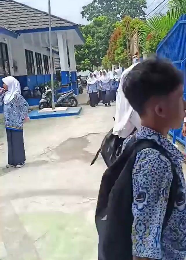 group of students walking on a concrete walkway outside of a school building. The students are wearing school uniforms consisting of white headscarves, white shirts, patterned tops, and black skirts or pants. Some of the students are carrying backpacks. The school building has white walls with blue trim and a gray tiled roof. There is a blue fence on one side of the walkway and trees in the background. Some scooters are parked near the flagpole. The students are walking in different directions, some in groups and others alone. They are talking and laughing as they walk. One student walks by filming.