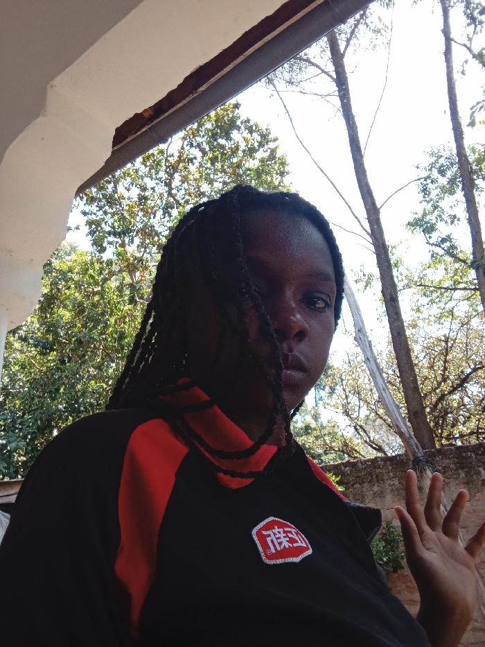 An individual with dark skin and braided hair is centered in a medium close-up shot, positioned outdoors in Mahiakalo ward, Kenya