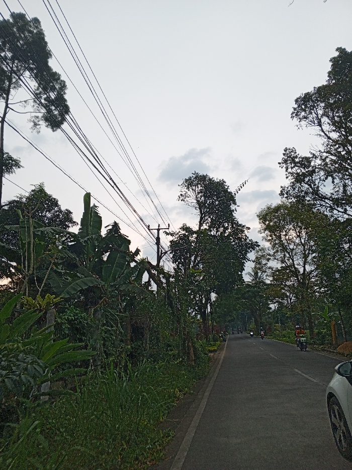 The image depicts a semi-urban or rural road scene in Kheda, India, likely during overcast conditions or twilight. A paved, dark grey two-lane road stretches from the foreground into the distance, with a white solid line delineating its left edge. On the immediate left, a dense border of lush green vegetation includes large-leafed plants resembling banana trees, smaller shrubs, and tall grass. A concrete utility pole or fence post is partially visible within this foliage. Further left and extending diagonally across the upper left sky, multiple dark utility wires are strung overhead, connected to a utility pole positioned slightly right of the frame's vertical center, partially obscured by trees. The right side of the road is also lined with dense green trees and vegetation, forming a partial canopy further down the road. In the immediate bottom right foreground, a portion of a white vehicle, specifically its front fender and a wheel with dark spokes, is visible. Several individuals on motorcycles or scooters are present on the road in the mid-distance. One motorcycle on the right side of the road features an individual wearing a light brown or orange helmet, possibly with a passenger. Additional motorcycles are faintly discernible further down the road, traveling away from the viewer. The sky is a light, overcast grey with some darker cloud formations.