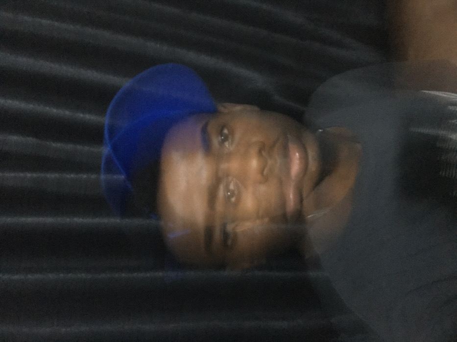 A blurry, close-up shot of a person wearing a blue hat and a dark t-shirt. The person has dark skin and is lying on a dark, textured surface with horizontal lines. Their face is partially obscured due to the blur, but their eyes, nose, and mouth are visible. A necklace is faintly visible around their neck. The background is dark and indistinct, contributing to the overall blurred effect.