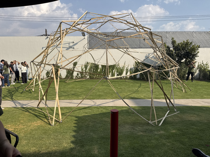 The scene is set outdoors in San Bernardino Tlaxcalancingo, Mexico, under a partially cloudy daytime sky. A large, partially collapsed geodesic-like structure, constructed from slender light-colored wooden or bamboo poles connected by various joints, occupies the central and right foreground, resting on a manicured green lawn. Numerous structural elements exhibit bending and fracture, resulting in the structure's significant deformation and partial collapse onto the grass. A narrow, light-colored paved pathway horizontally traverses the midground. To the left of this pathway, a group of approximately ten casually dressed adults stands on the pavement, observing the collapsed structure; some individuals appear to be engaged in conversation. On the far right, a single individual wearing an olive green shirt and dark pants stands on the grass, holding a device resembling a camera or smartphone, pointed towards the structure. The background consists of a tall, unadorned white wall, with a section of a grey tiled roof visible above it on the left. Green shrubbery and a small tree are planted along the base of the wall on the right. Overhead utility wires are visible against the sky in the upper left quadrant. A red cylindrical post is present in the immediate foreground, slightly to the right of the center. Direct sunlight casts distinct shadows across the grass.